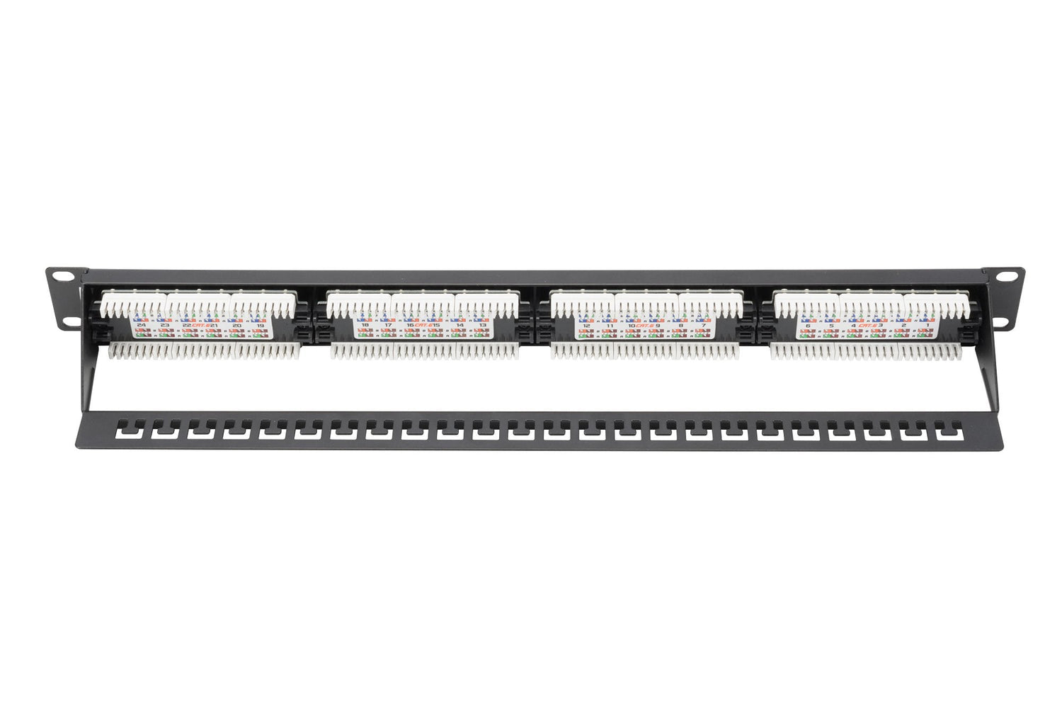 El panel de conexión CAT 6 sin apantallar de DIGITUS® está disponible con 16 o 24 puertos (1 unidad rack) o 48 puertos (2 unidades rack). Fabricado y certificado por UL de conformidad con los requisitos del Enlace de Rendimiento de clase E, para hasta 250 MHz, ISO/IEC 11801 y EN 50173. La carcasa está hecha de acero laminado de 1,5 mm galvanizado en frío y por ello es perfecta para montaje en armarios de 19".