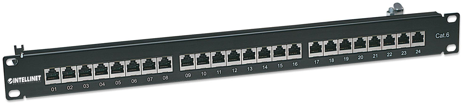 Intellinet 720038. Estándares de red: IEEE 802.3, IEEE 802.3ab, IEEE 802.3u, Tipo de interfaz ethernet: Ethernet rápido, Gigabit Ethernet, Conector: RJ-45. Color del producto: Negro, Montaje: Montaje en bastidor, Capacidad del rack: 1U. Certificados de conformidad: RoHS, Certificación: UL, CE. Ancho: 44 mm, Altura: 110 mm, Profundidad: 482 mm
