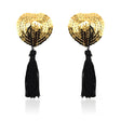 Unas pezoneras autoadhesivas en forma de corazón están recubiertas de lentejuelas doradas y cuenta con un largo pompón negro, ideal para completar cualquier look y sorprender a quien tengas delante.