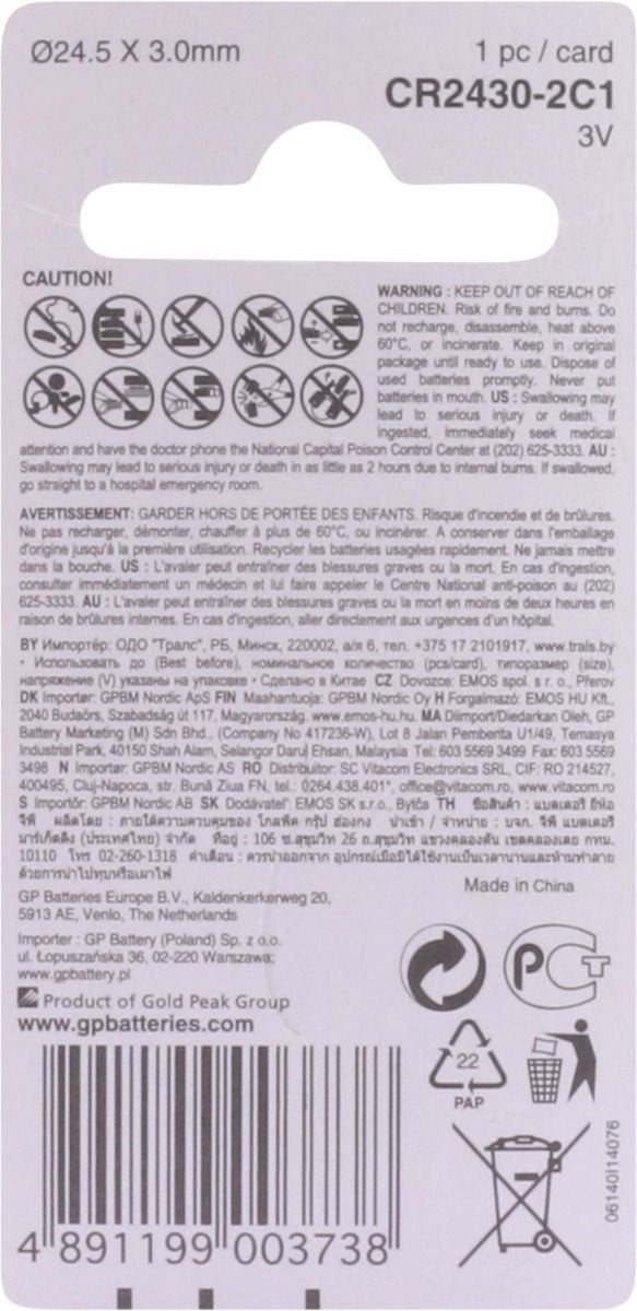 GP Batteries Lithium Cell Lithium CR2430 - 1, Batería de un solo uso, Litio, 3 V, 1 pieza(s), Acero inoxidable, 3 mm