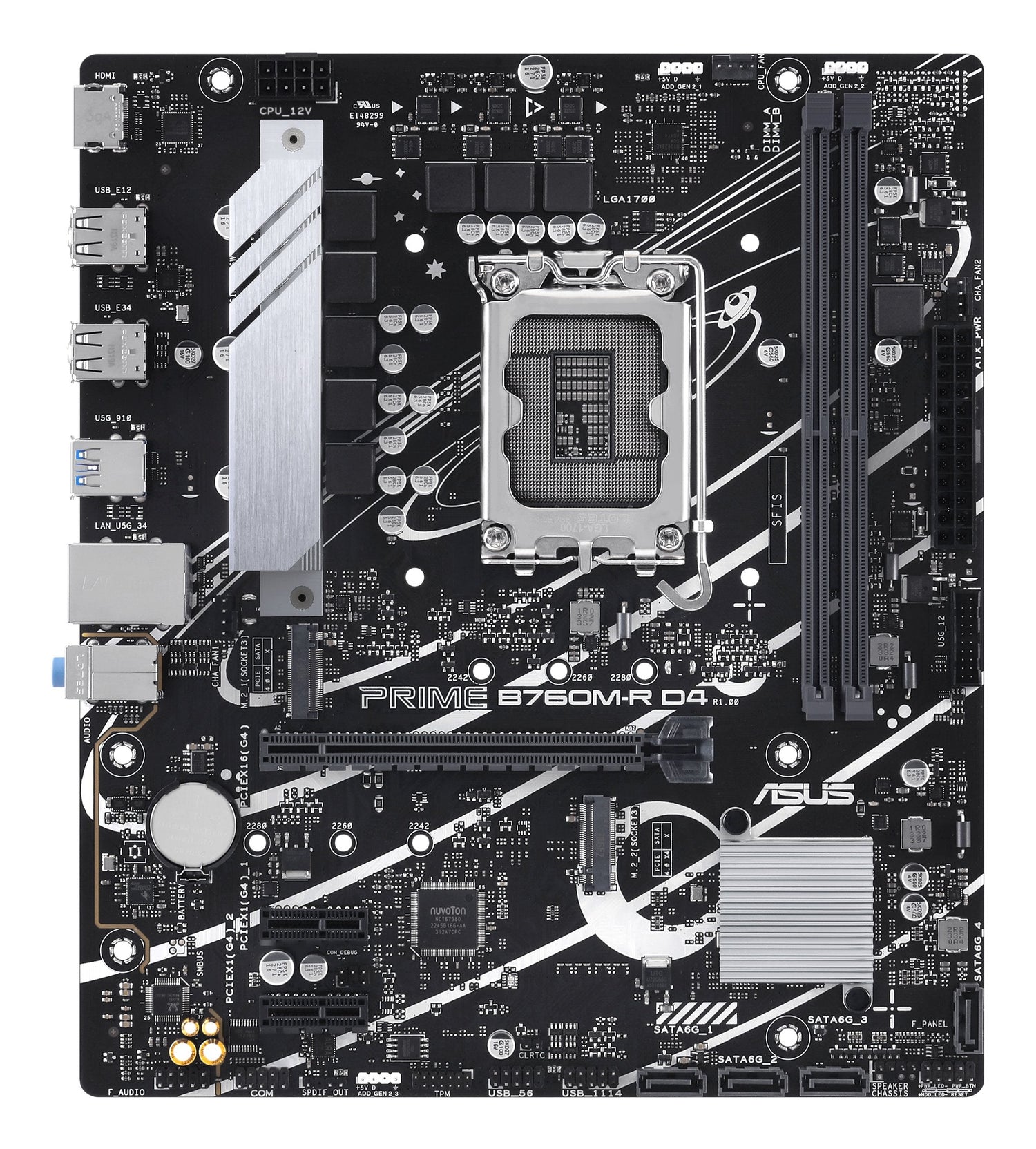 ASUS PRIME B760M-R D4, Intel, LGA 1700, Intel Core i9 14th Gen, Intel Core i3 12th Gen, Intel Core i3 13th Gen, Intel Core i5 12th Gen,..., LGA 1700, DDR4-SDRAM, 64 GB