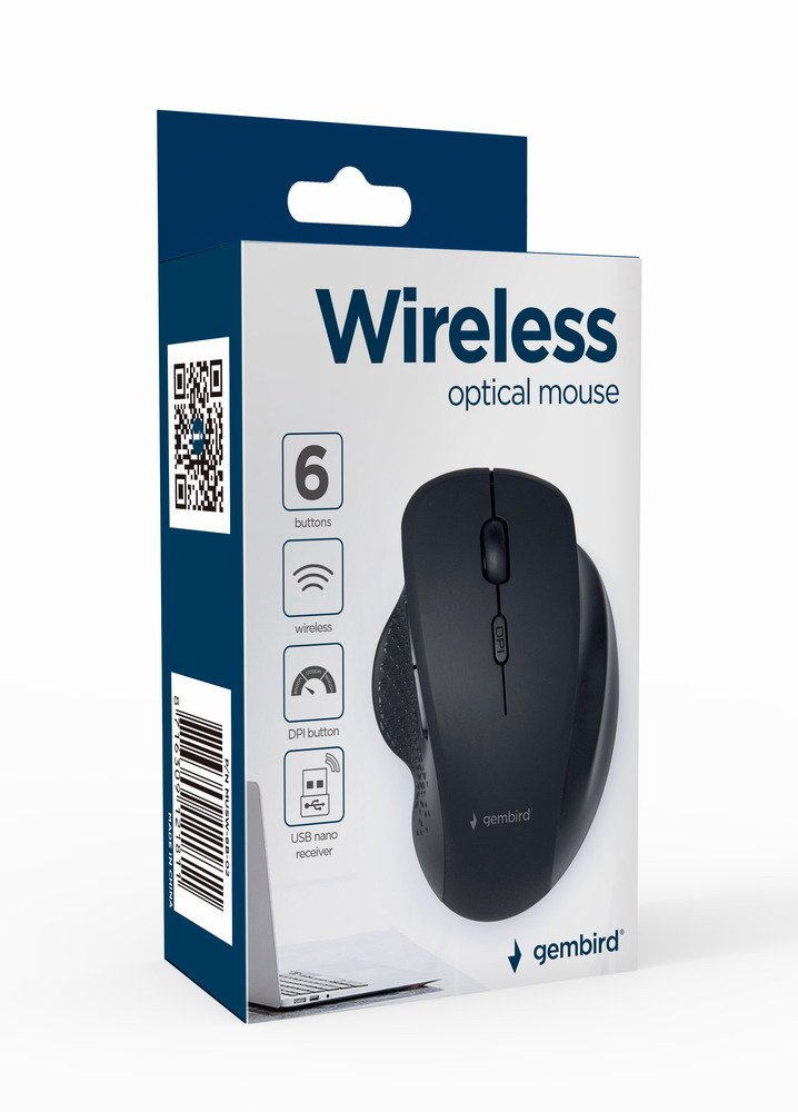 Gembird MUSW-6B-02. Factor de forma: mano derecha. Tecnología de detección de movimientos: Óptico, Interfaz del dispositivo: RF inalámbrico, Resolución de movimiento: 1600 DPI, Tipo de botones: Botones presionados, Cantidad de botones: 6, Tipo de desplazamiento: Rueda. Fuente de energía: Baterías. Color del producto: Negro