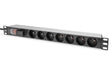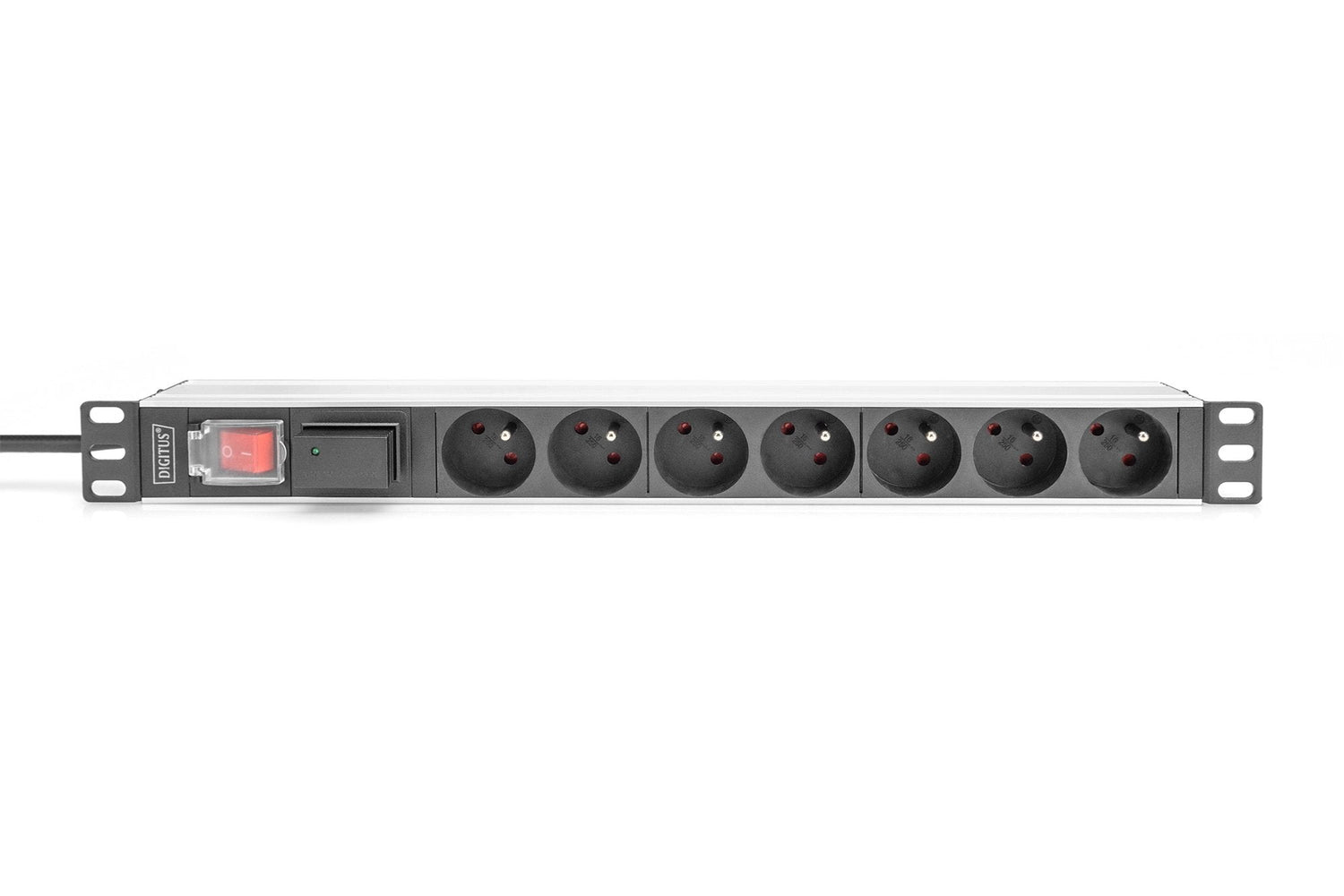 Digitus Socket strip with aluminum profile and switch, 7-way CEE 7/5 sockets, 2 m cable with surge protection and switch. PDU tipos: Conmutado, Capacidad del rack: 1U, Factor de forma: Montaje en rack o Montaje en bastidor. Cantidad de salidas AC: 7 salidas AC, Tipo de salida AC: Tipo E, Conector: Tipo F. Longitud de cable: 2 m. Voltaje nominal de entrada: 230 V, Máxima corriente: 16 A, Frecuencia de entrada AC: 50 - 60 Hz. Ancho: 45 mm, Profundidad: 45 mm, Altura: 482,6 mm
