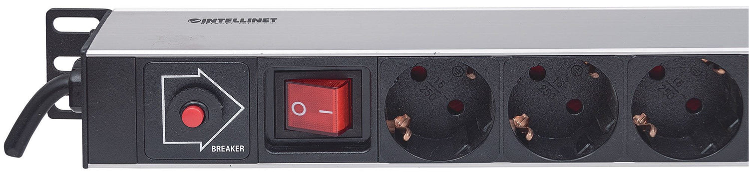 Intellinet 714044. Capacidad del rack: 1U, Montaje: Horizontal, Material de la carcasa: Aluminio. Cantidad de salidas AC: 12 salidas AC, Tipo de salida AC: Tipo F. Longitud de cable: 1,8 m. Voltaje nominal de entrada: 250 V, Máxima corriente: 16 A, Funciones de protección de poder: Sobrecarga. Ancho: 44,4 mm, Profundidad: 675 mm, Altura: 63 mm