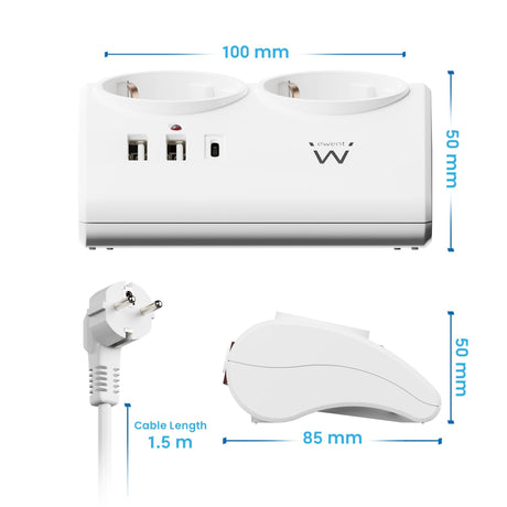 Regleta Ewent 2 Tomas Shucko 2 Puertos Usb Tipo A 1 Puerto Usb Tipo C Interruptor Blanco