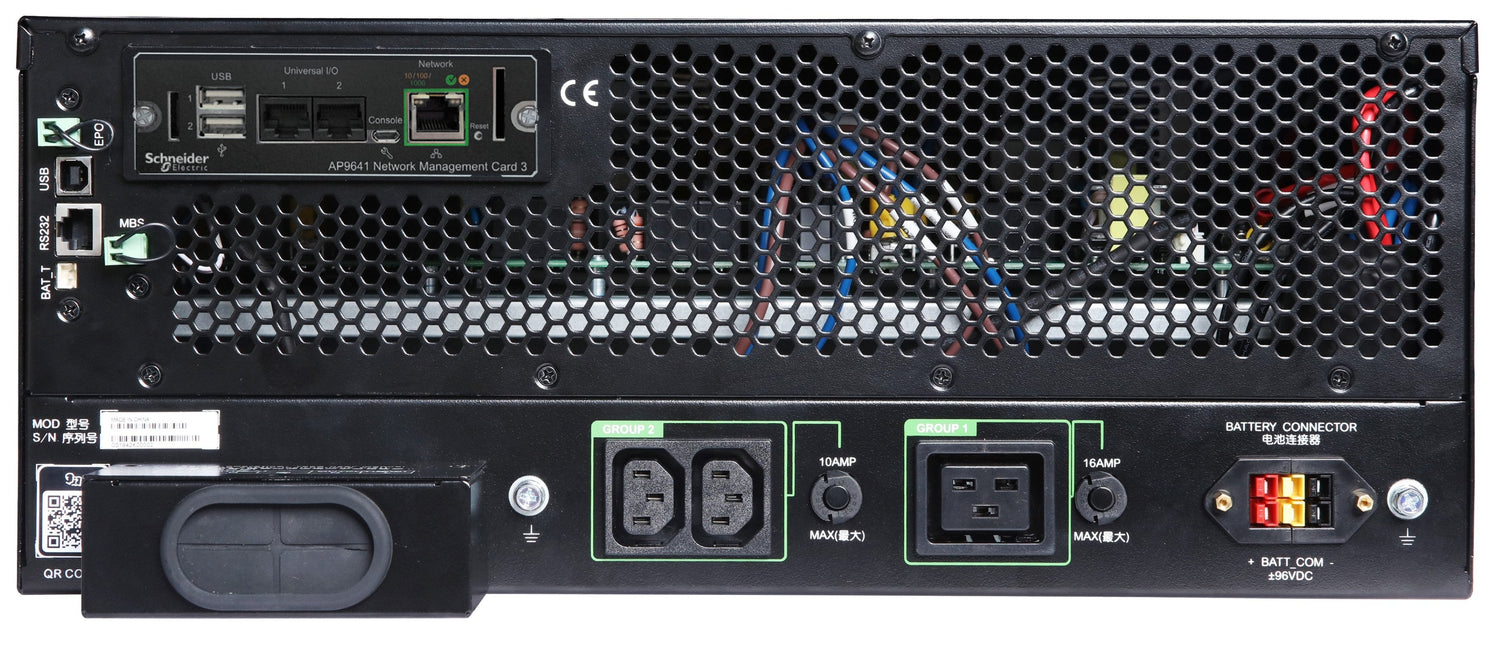 APC SRTG6KXLI. Topología UPS: Doble conversión (en línea), Capacidad de potencia de salida (VA): 6 kVA, Potencia de salida: 6000 W. Tipo de salida AC: C13 acoplador, C19 acoplador, Cantidad de salidas AC: 3 salidas AC. Tecnología de batería: Sealed Lead Acid (VRLA), Voltaje de la pila: 96 V, Vida útil de la batería (máx.): 5 año(s). Factor de forma: Compacto, Color del producto: Negro, Tipo de visualizador: LCD. Certificación: CE, EN/IEC 62040-1