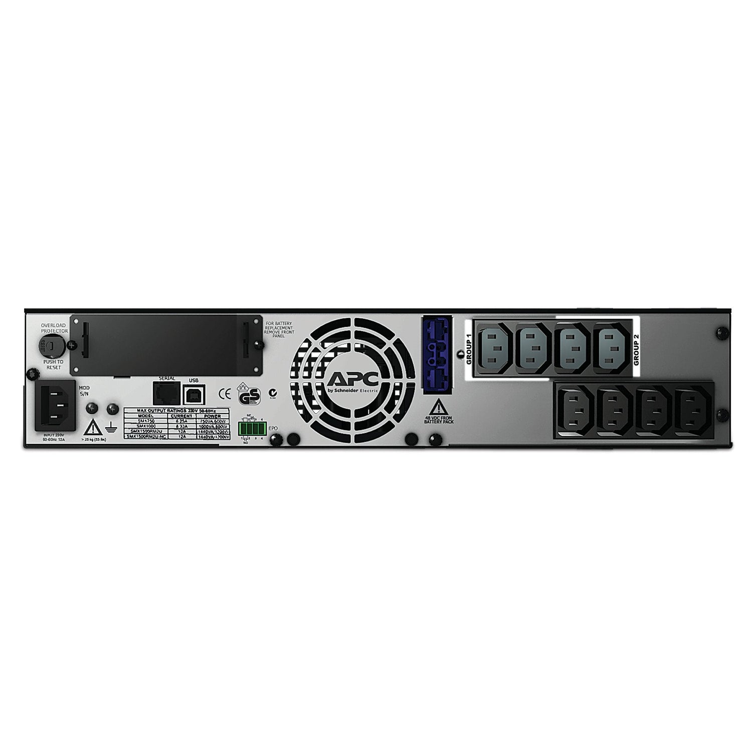 APC Smart-UPS. Topología UPS: Línea interactiva, Capacidad de potencia de salida (VA): 1 kVA, Potencia de salida: 800 W. Tipo de salida AC: C13 acoplador, Conector: C14 acoplador, Cantidad de salidas AC: 8 salidas AC. Tecnología de batería: Sealed Lead Acid (VRLA), Capacidad de la batería: 299 VAh, Tiempo típico de respaldo a carga completa: 8,1 min. Factor de forma: Montaje en rack/Torre o Montaje en bastidor/Torre, Color del producto: Negro, Capacidad del rack: 2U. Certificados de conformidad: RoHS, Certificación: CE, EN/IEC 62040-1, EN/IEC 62040-2, RCM, VDE, REACH, PEP, EOLI