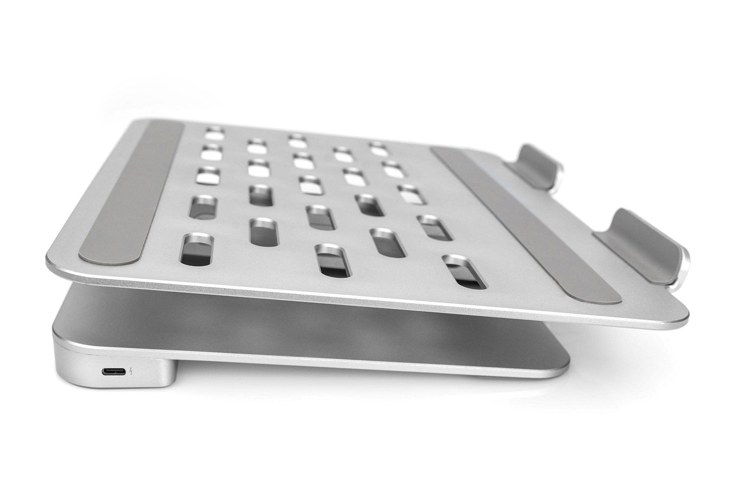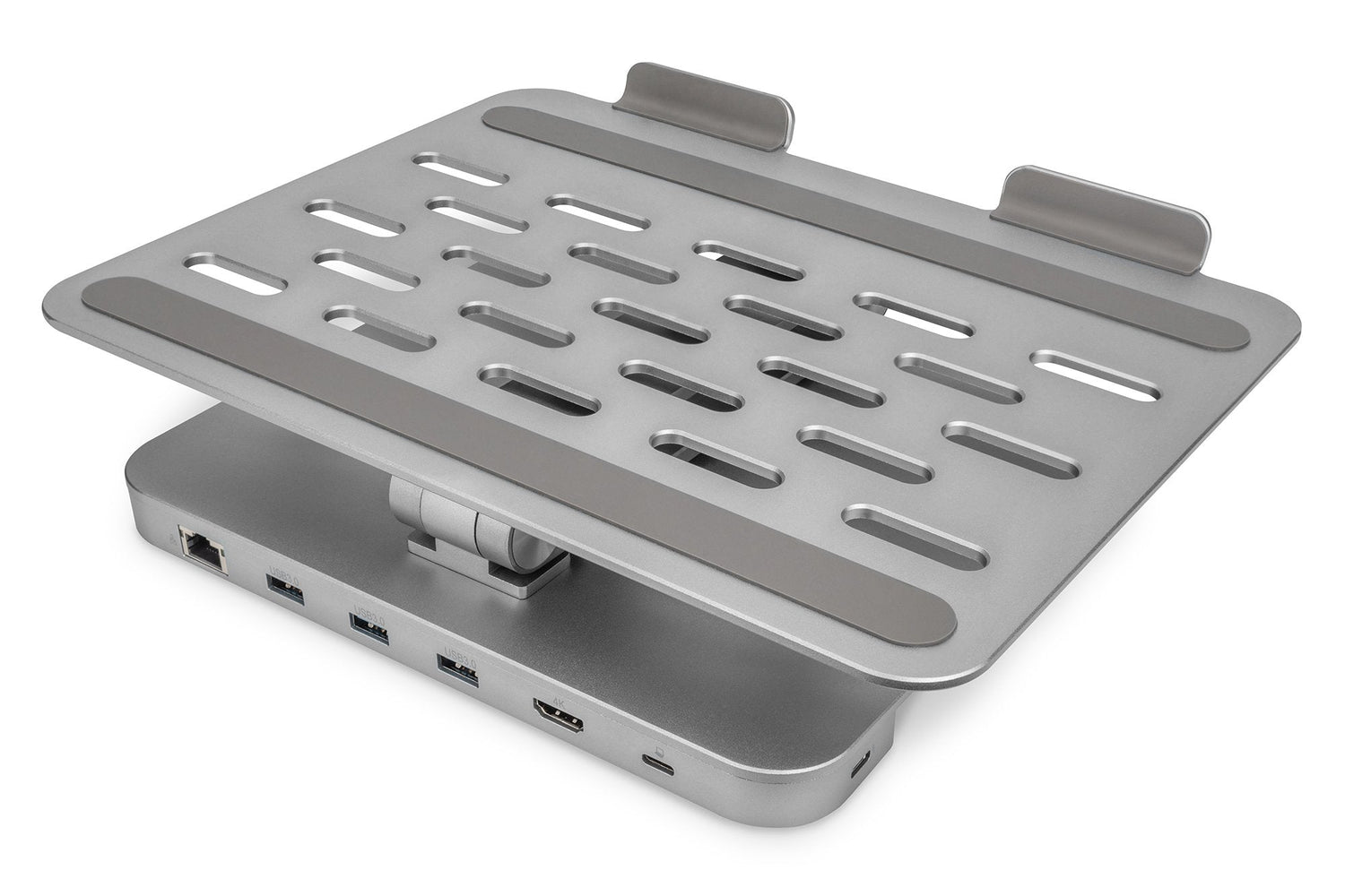 Digitus Soporte variable para ordenador portátil/tableta con estación de acoplamiento USB-C™ de 6 puertos. Tipo de producto: Soporte para ordenador portátil, Color del producto: Plata, Material: Aluminio. Sistema operativo Windows soportado: Windows 10, Windows 11, Windows 7, Windows 8, Sistema operativo MAC soportado: Mac OS X 10.10 Yosemite, Mac OS X 10.11 El Capitan, Mac OS X 10.12 Sierra, Mac OS X 10.13 High.... Ancho: 280 mm, Profundidad: 257 mm, Altura: 56 mm. Ancho del paquete: 295 mm, Profundidad del paquete: 262 mm, Altura del paquete: 57 mm. Cables incluidos: USB