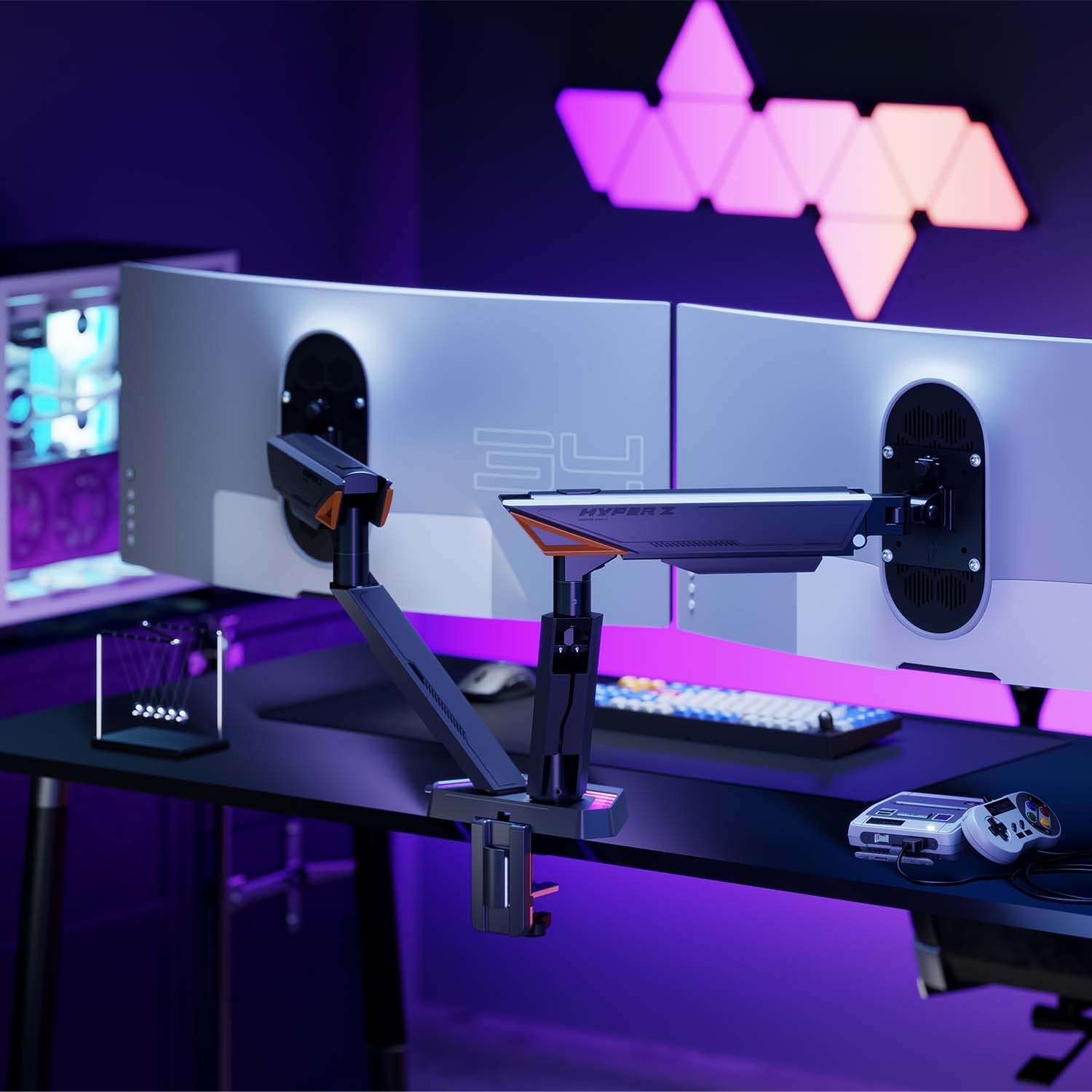 - Soporte de mesa RGB GAMING contrapeso giratorio e inclinable para monitor/TV (3 pivotes, 2 brazos) de 17”-38”