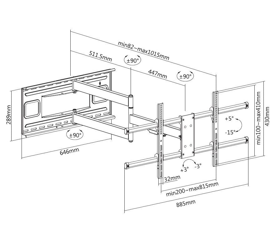 Equip Soporte de pared para TV de movimiento completo con brazo largo de 43"-80. Capacidad máxima de peso: 50 kg, Tamaño mínimo de pantalla: 109,2 cm (43"), Tamaño máximo de pantalla: 2,03 m (80"), Compatibilidad con interfaz de montaje (min): 200 x 200 mm, Compatibilidad con interfaz de montaje (max): 800 x 400 mm. Ángulo de inclinación: -15 - 5°, Distancia a la pared (min): 8,2 cm, Distancia a la pared (max): 101,5 cm. Color del producto: Negro