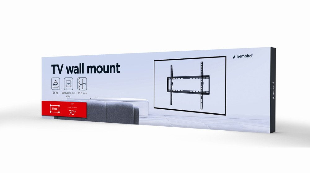 Gembird WM-70F-03. Capacidad máxima de peso: 35 kg, Tamaño mínimo de pantalla: 94 cm (37"), Tamaño máximo de pantalla: 177,8 cm (70"), Compatibilidad con interfaz de montaje (min): 200 x 200 mm, Compatibilidad con interfaz de montaje (max): 600 x 400 mm. Distancia a la pared (min): 2,05 cm. Color del producto: Negro