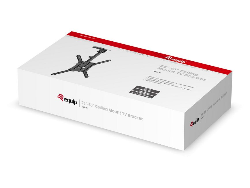 Equip Soporte de TV para montaje en techo de 23"-55. Capacidad máxima de peso: 20 kg, Tamaño mínimo de pantalla: 58,4 cm (23"), Tamaño máximo de pantalla: 139,7 cm (55"), Compatibilidad con interfaz de montaje (min): 75 x 75 mm, Compatibilidad con interfaz de montaje (max): 400 x 400 mm. Rango de ajustes de altura: 520 - 614 mm, Ángulo de inclinación: 0 - 80°, Ángulo de giro (alcance): -45 - 45°, Distancia a la pared (max): 8,3 cm. Color del producto: Negro