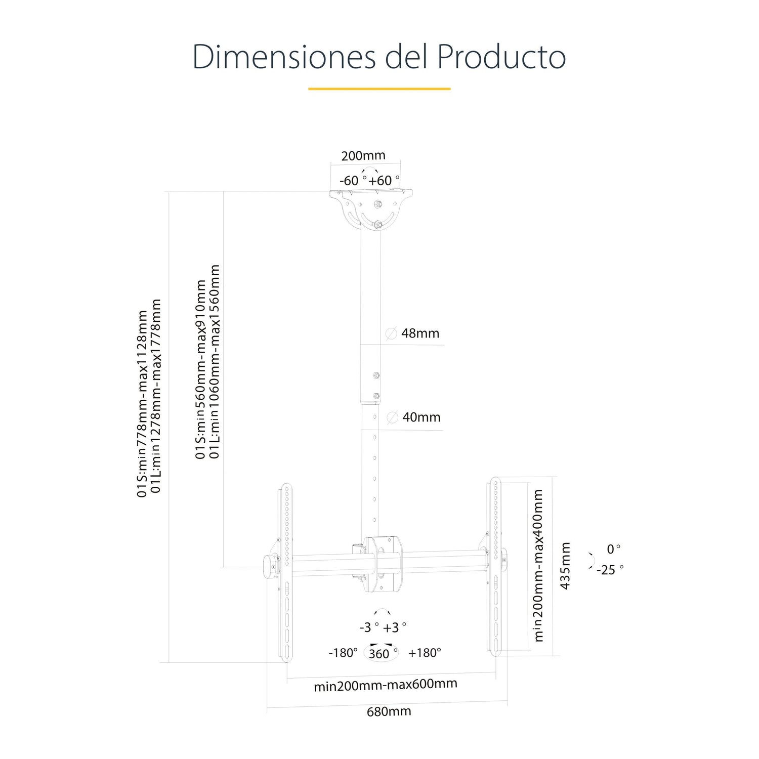 Con un poste telescópico, el soporte para TV le permite suspender una pantalla a la distancia que desee del techo. Esto funciona bien con una gama de alturas de techo. El poste de acero puede extenderse de 42" a 61" (1060 a 1560 mm), con una elevación total (extensión de altura) de 19.7" (500 mm).