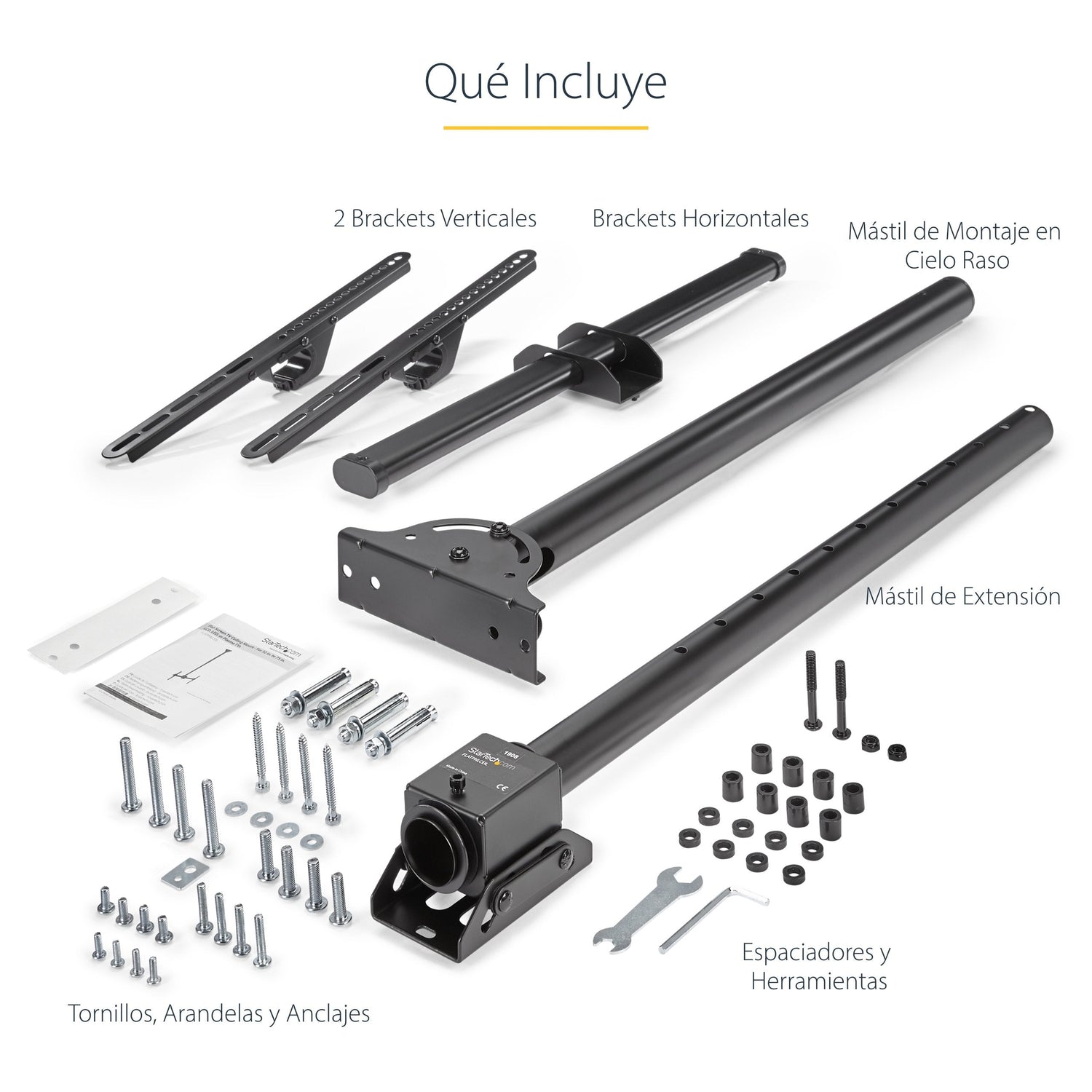 - SOPORTE DE TECHO PARA TV DE 75": El soporte de techo compatible con VESA admite pantallas, incluyendo televisores curvos de hasta 75" (110 lb/50 kg) - Mástil ajustable en altura, de 3.5' (106cm) a 5.0' (156cm) desde el techo