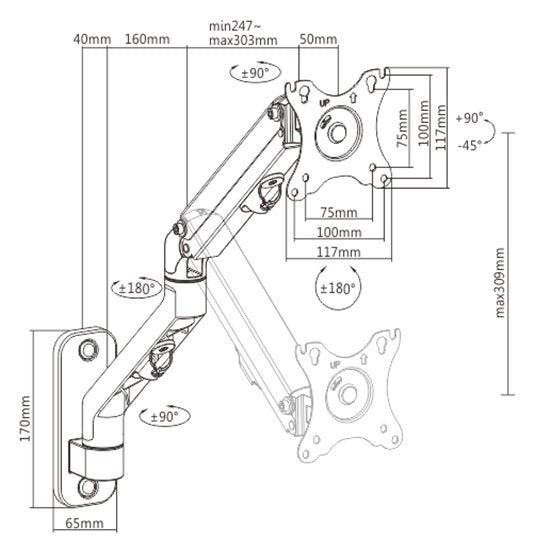 Gembird MA-WA1-02. Capacidad máxima de peso: 7 kg, Tamaño mínimo de pantalla: 43,2 cm (17"), Tamaño máximo de pantalla: 68,6 cm (27"), Compatibilidad con interfaz de montaje (min): 75 x 75 mm, Compatibilidad con interfaz de montaje (max): 100 x 100 mm. Ajustes de altura, Ángulo de giro (alcance): -90 - 90°, Ángulo de inclinación: -45 - 90°. Color del producto: Negro
