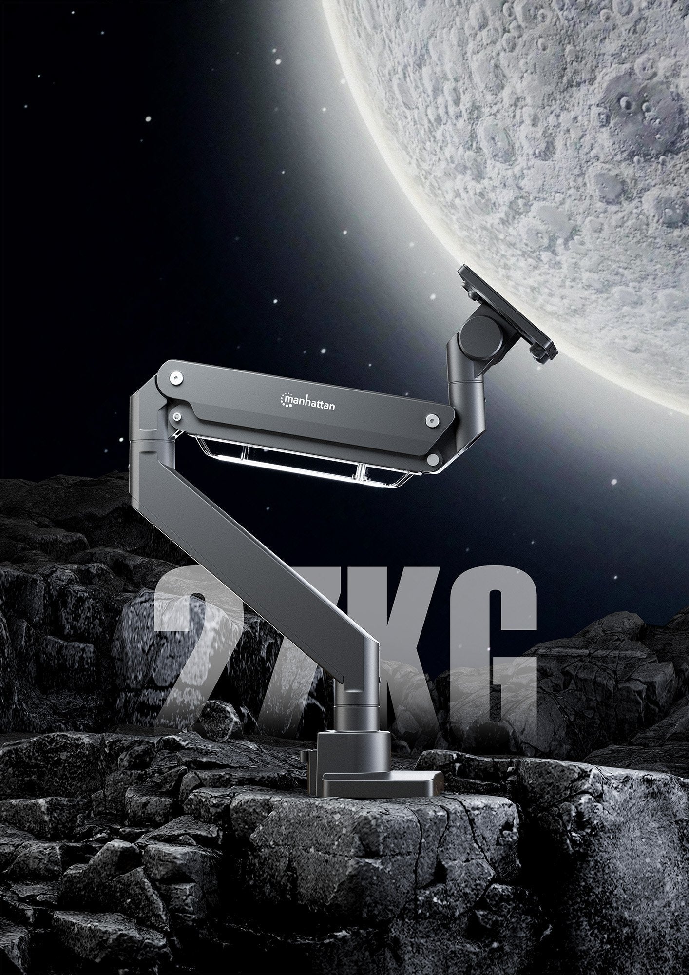 Manhattan 462594. Montaje: Pinza/Atornillado, Capacidad máxima de peso: 27 kg, Tamaño mínimo de pantalla: 43,2 cm (17"), Tamaño máximo de pantalla: 144,8 cm (57"), Compatibilidad con interfaz de montaje (min): 75 x 75 mm, Compatibilidad con interfaz de montaje (max): 200 x 200 mm. Ajustes de altura, Ángulo de inclinación: -20 - 60°. Color del producto: Negro