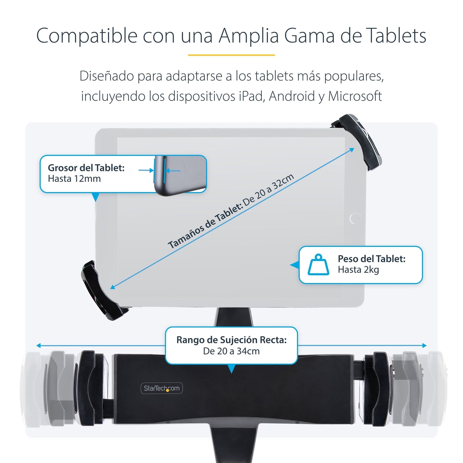 El diseño inteligente no bloquea los puertos, la cámara frontal ni los botones, lo que permite a los usuarios utilizar todas las funciones del tablet (retire cualquier funda protectora del tablet). El plato lastrado de 0,35kg puede añadirse al soporte del tablet, para garantizar un funcionamiento óptimo de brazos del monitor con resorte/de un solo toque.