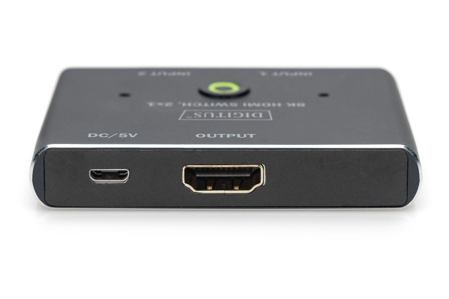 Digitus Conmutador 8K HDMI, 2x1. Tipo de puerto de vídeo: HDMI, Versión HDMI: 2.0/2.1, Tipo de puerto USB: MicroUSB. Material: Aluminio, Color del producto: Negro, Máxima velocidad de actualización: 60 Hz. Ancho: 57 mm, Profundidad: 70 mm, Altura: 13 mm. Ancho del paquete: 20 mm, Profundidad del paquete: 133 mm, Peso del paquete: 108 g. Cantidad por paquete: 1 pieza(s), Cables incluidos: USB