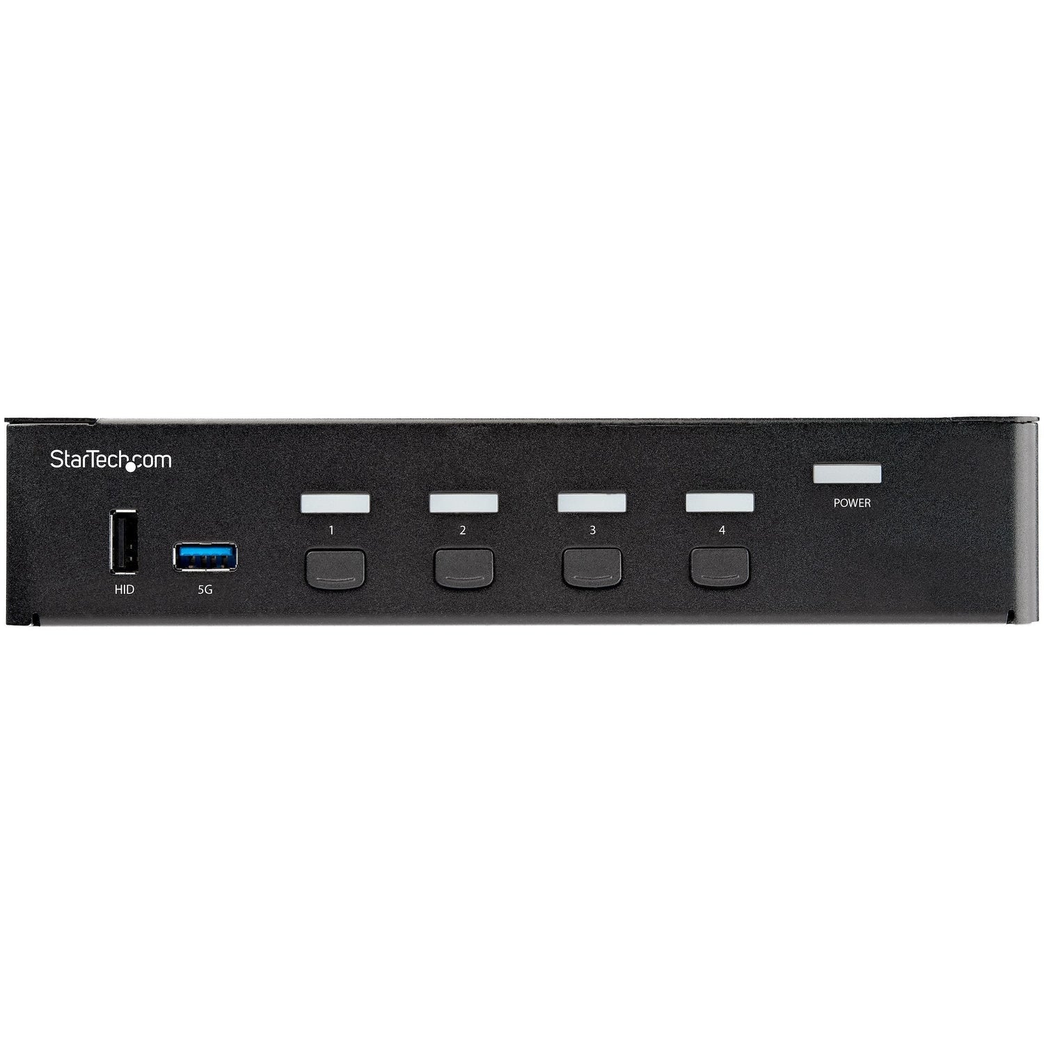 StarTech.com Switch Conmutador KVM de 4 Puertos HDMI 2.0 4K para 1 Monitor - Vídeo de 4K y 60Hz Ultra HD - HDR - Hub Ladrón USB 3.0 de 2 Puertos y 4 Puertos USB 2.0 HID - Audio - HotKey - TAA. Tipo de puerto de teclado: USB, Tipo de puerto de ratón: USB, Tipo de puerto de vídeo: HDMI. Tipo HD: 4K Ultra HD, Máxima resolución: 3840 x 2160 Pixeles, Tasa de transferencia de datos (max): 5 Gbit/s. Color del producto: Negro, Material de la carcasa: Acero, Tiempo medio entre fallos: 143000 h. Voltaje de entrada: 100 - 240 V, Corriente de entrada: 1 A, Voltaje de salida: 12 V. Ancho: 130 mm, Profundidad: 220 mm, Altura: 44 mm