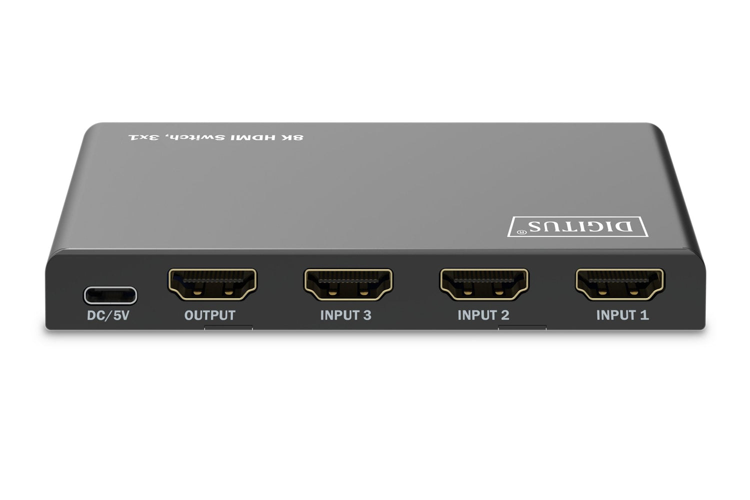 Digitus Conmutador 8K HDMI, 3x1. Tipo de puerto de vídeo: HDMI, Tipo de puerto USB: USB Tipo C. Material: Metal, Color del producto: Negro, Ancho de banda: 48 Gbit/s. Consumo energético: 5 W. Ancho: 56 mm, Profundidad: 112 mm, Altura: 14 mm. Ancho del paquete: 123 mm, Profundidad del paquete: 179 mm, Altura del paquete: 45 mm