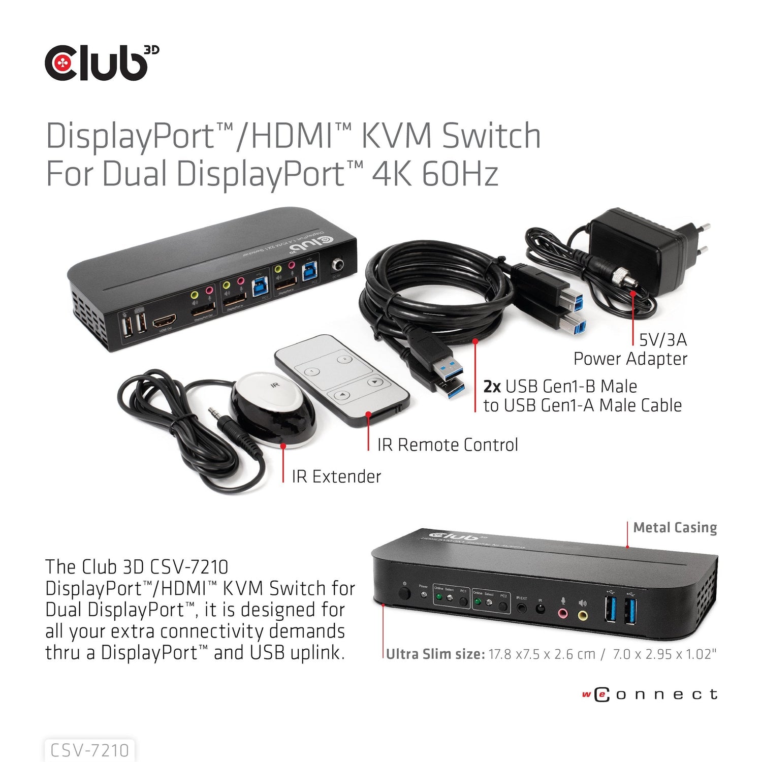 CLUB3D CSV-7210. Tipo de puerto de teclado: USB, Tipo de puerto de ratón: USB, Tipo de puerto de vídeo: HDMI/DisplayPort. Tipo HD: 4K Ultra HD, Máxima resolución: 4096 x 2160 Pixeles, Ancho de banda de vídeo: 60 Hz. Color del producto: Negro, Material de la carcasa: Metal. Fuente de energía: CC, Voltaje de entrada: 5 V, Consumo energético: 12 W. Ancho: 178 mm, Profundidad: 75 mm, Altura: 26 mm