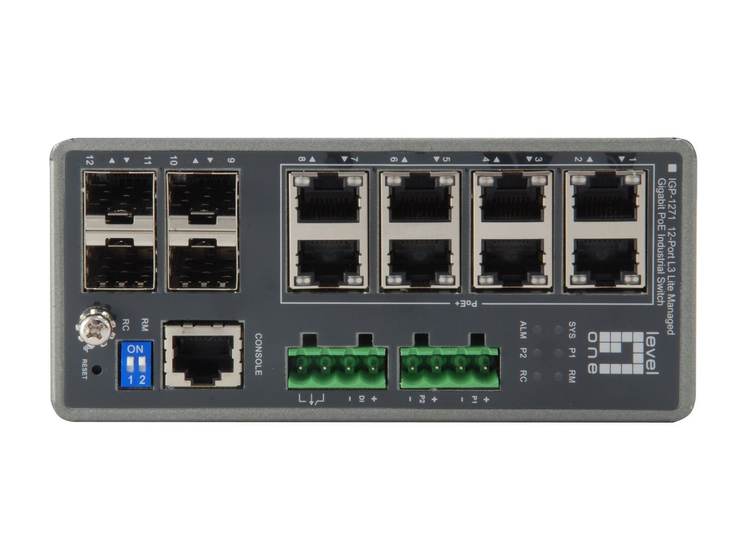LevelOne IGP-1271. Tipo de interruptor: Gestionado, Capa del interruptor: L3. Puertos tipo básico de conmutación RJ-45 Ethernet: Gigabit Ethernet (10/100/1000), Cantidad de puertos básicos de conmutación RJ-45 Ethernet: 16, Puerto de consola: RJ-45. Tabla de direcciones MAC: 8000 entradas, Capacidad de conmutación: 24 Gbit/s. Estándares de red: IEEE 802.1D, IEEE 802.1Q, IEEE 802.1ab, IEEE 802.1ag, IEEE 802.1p, IEEE 802.1s, IEEE 802.1w, IEEE.... Voltaje de entrada DC: 48 - 57 V. Energía sobre Ethernet (PoE)