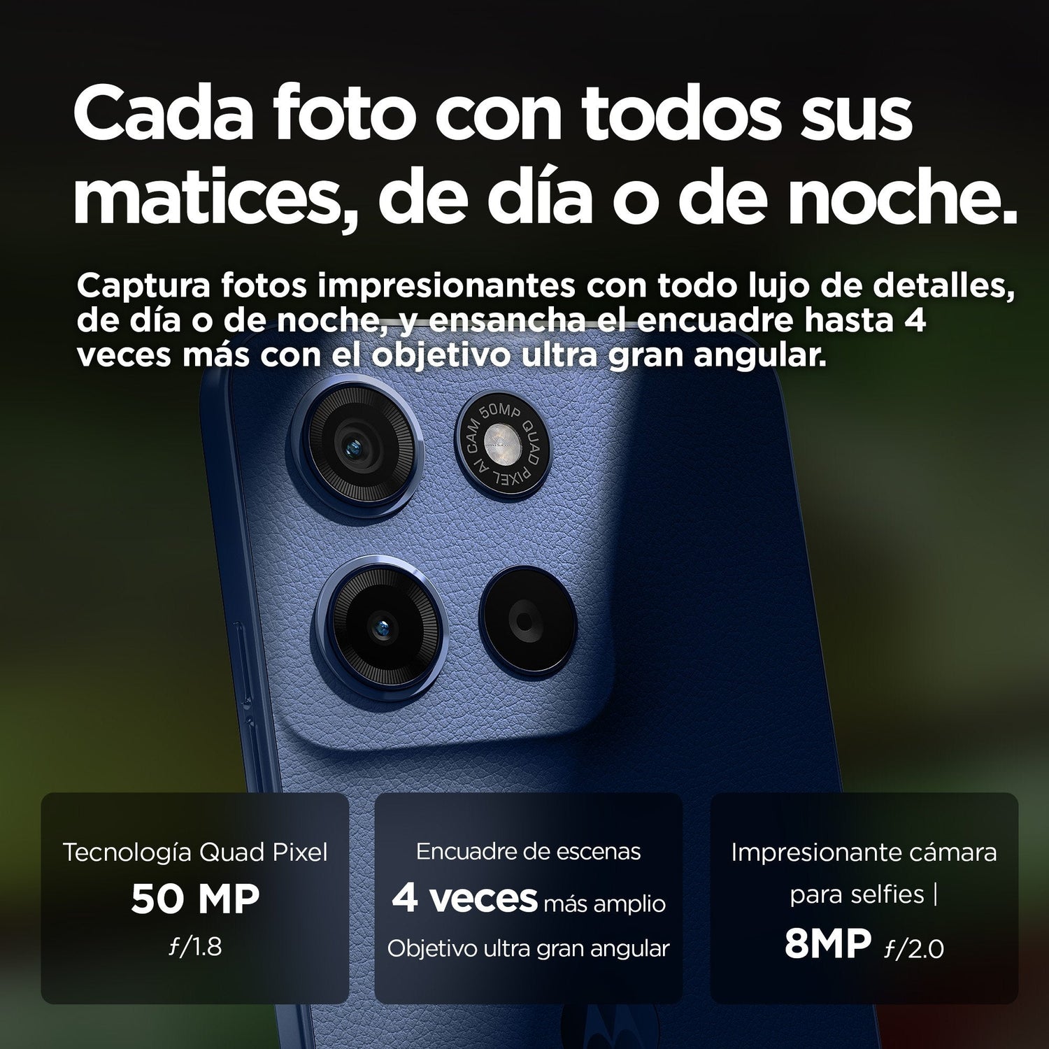 - Sistema de cámaras de 50 MP1 y objetivo ultra gran angular. Captura fotos impresionantes con todo lujo de detalle, de día o de noche, y abarca más en el encuadre con el objetivo ultra gran angular