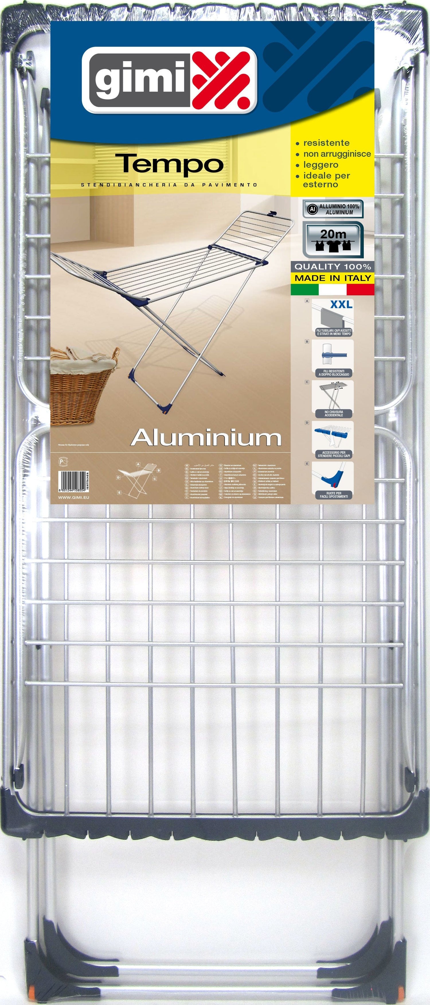 Gimi Stendibiancheria da Pavimento Tempo in Alluminio 20 mt Stendibili. Tipo: Tendedero de suelo, Material: Aluminio, Color del producto: Aluminio, Negro. Ancho: 1670 mm, Profundidad: 555 mm, Altura: 915 mm. Ancho del paquete: 585 mm, Profundidad del paquete: 195 mm, Altura del paquete: 1310 mm. Cantidad por paquete: 1 pieza(s)