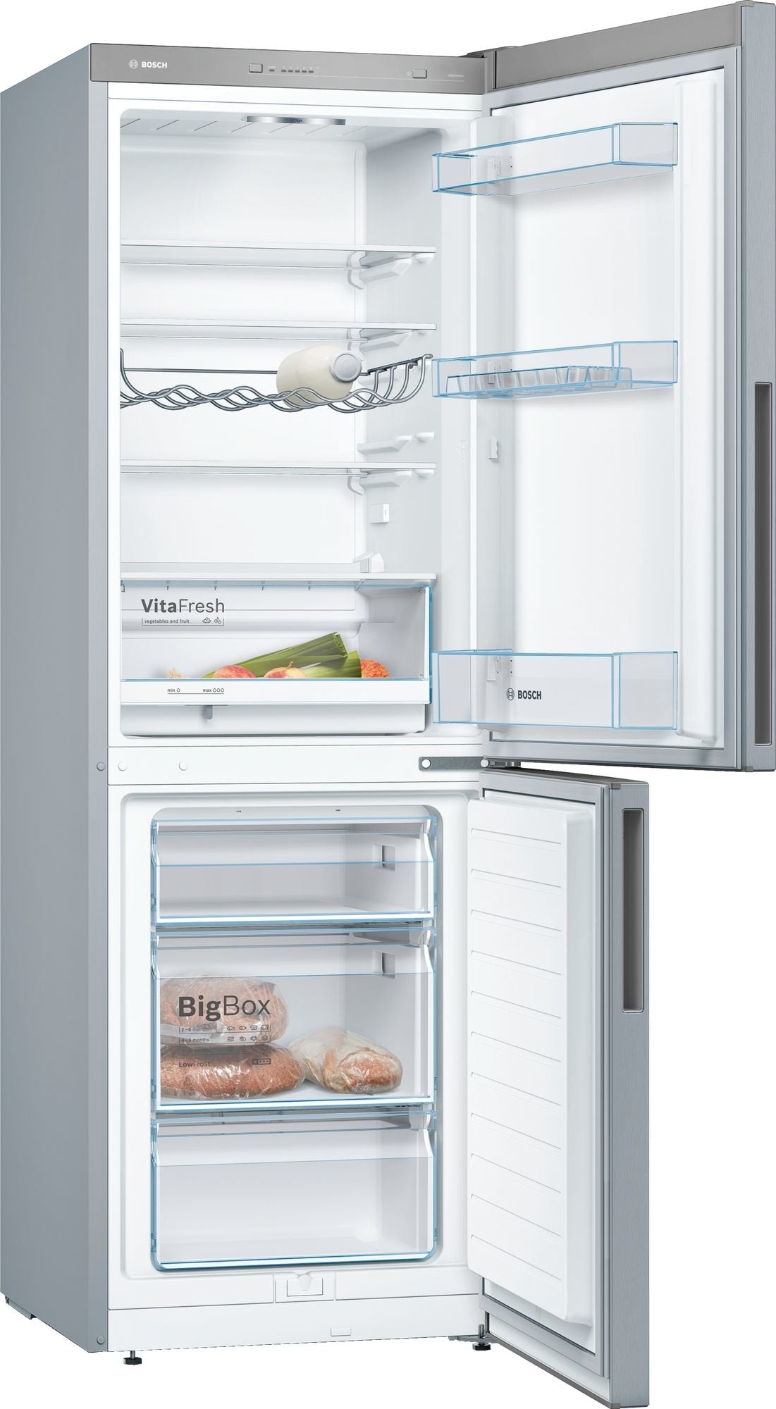 Bosch Serie 4 KGV33VLEA. Capacidad neta total: 289 L. Bisagra para puerta: Derecho. Clase climática: SN-T, Nivel de ruido: 39 dB. Frigorífico, capacidad neta: 195 L, Luz interior de la nevera, Frigorífico, número de compartimentos: 4, Número de compartimientos para verduras: 1. Congelador, capacidad neta: 94 L, Capacidad de congelación: 4,5 kg/24h. Clase de eficiencia de energía: E, Consumo de energía anual: 228 kWh. Color del producto: Acero inoxidable