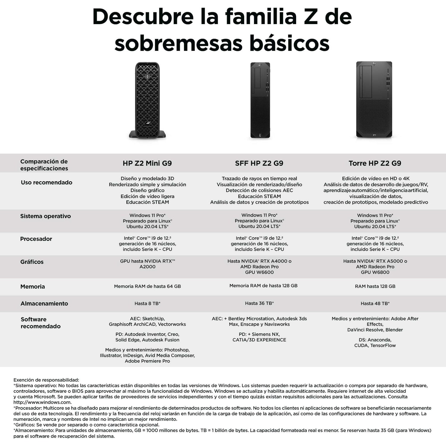 - Software incluido HP: HP PC Hardware Diagnostics UEFI; HP PC Hardware Diagnostics Windows; ZCentral Remote Boost; HP Image Assistant; HP Manageability Integration Kit; Performance Advisor 3.0