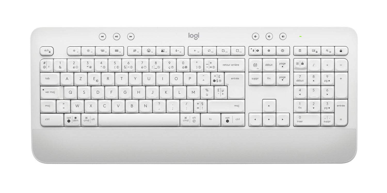 Logitech 920-011023. Formato del teclado: Completo (100%). Estilo de teclado: Derecho. Tecnología de conectividad: Inalámbrico, Interfaz del dispositivo: Bluetooth, Interruptor del teclado: Interruptor de membrana, Diseño de teclado: AZERTY, Teclado, cantidad de teclas: 118. Descansa muñecas. Uso recomendado: Oficina. Color del producto: Blanco. Ratón incluido