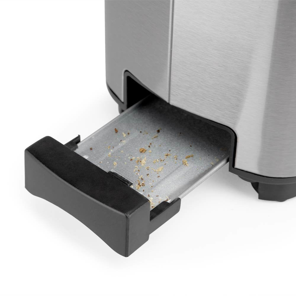 Entre los aspectos más innovadores de esta tostadora encontrarás sus 6 niveles de tostado y las funciones de recalentamiento y descongelación. De esta forma, la facilidad de tostar hasta cuatro rebanadas de pan simultáneamente o una gran rebanada, es pan comido.