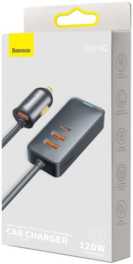 Baseus Rychlo Nabíjecka Do Auta S ProdluOvacím Kabelem 3x Usb-A, 1x Type-C 120w Edá