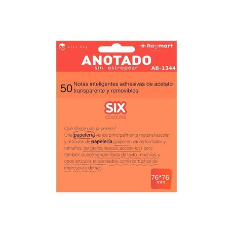 Roymart Bloc Notas Adhesivas Inteligentes Removibles Transparentes 50h 76x76mm Acetato Naranja Flúor