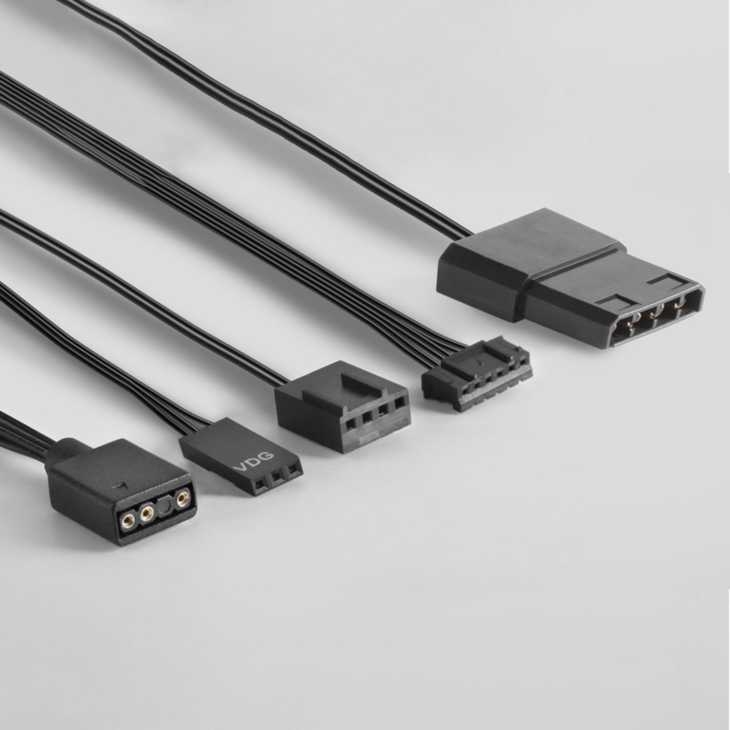 El MF-3D permite una increíble variedad de posibilidades de conexión: directamente a la placa base o a la fuente de alimentación para un efecto CHROMA RGB automático, a controladores ARGB con conectores de 3 o 6 pines, y con placas base Addressable RGB con sistemas Asus Aura Sync, Mystic Light Sync o RGB Fusion, permitiéndote un absoluto control de la iluminación y una libertad absoluta.