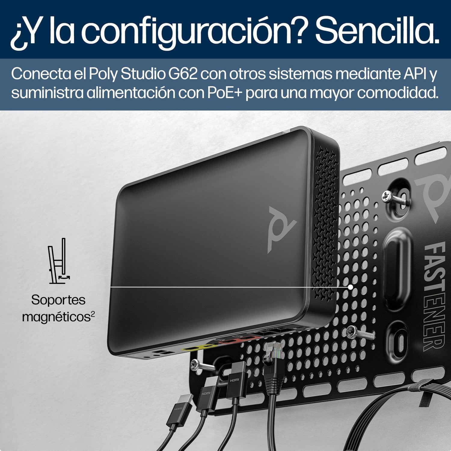 El sistema de videoconferencia Poly Studio G62 tiene una instalación sencilla, una integración impecable y el grado de personalización que necesitas. ¿Necesitas unas herramientas de colaboración eficaces? Las tienes. ¿Unas opciones audiovisuales avanzadas? También las tienes. ¿Una instalación flexible? Cuenta con ello.