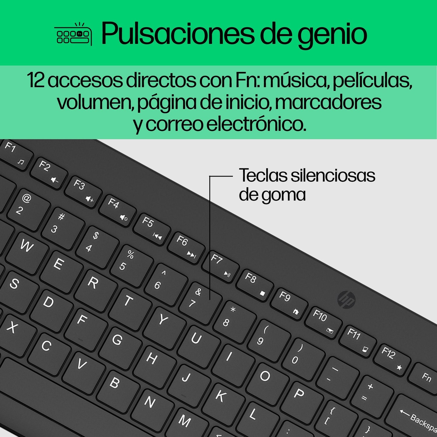 HP Combinación de teclado y ratón inalámbricos 330. Formato del teclado: Completo (100%), Tecnología de conectividad: Inalámbrico, Interfaz del dispositivo: RF inalámbrico, Uso recomendado: Universal. Color del producto: Negro. Ratón incluido