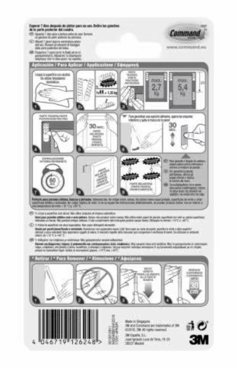 Consulta las instrucciones de uso: después de pintar, espera 7 días antes de usar los productos Command™. Después de colocar el gancho o tira en la pared, espera una hora antes de colgar nada. Perfectas para paredes sólidas, huecas y pintadas. No se deben utilizar sobre papel pintado, superficies de vinilo u otras superficies débiles o delicadas