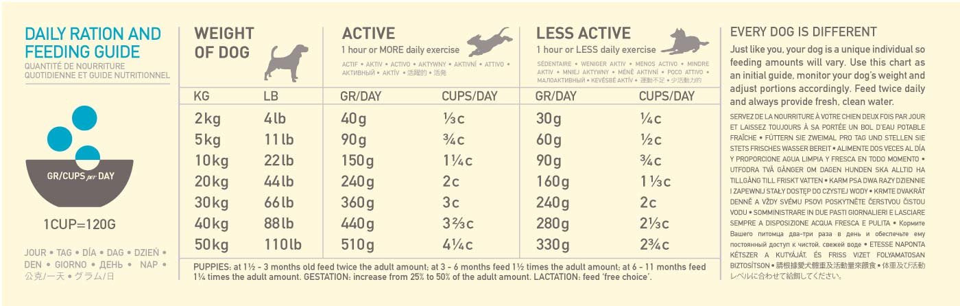 - Ingredientes: Frischer ganzer Hering (14%), frische ganze Sardinen (12%), frische ganze Flunder (8%), getrockneter Hering (8%), getrockneter Kabeljau (7%), getrockneter Weißfisch (7%), ganze grüne Erbsen, rote Linsen, Kichererbsen, grüne Linsen, Lachsöl (6%), frischer ganzer Silberhecht (4%), frischer ganzer Felsenbarsch (4%), gesprenkelte Bohnen, ganze gelbe Erbsen, sonnengereiftes Alfalfa, Sonnenblumenöl, Linsenfasern, brauner Seetang, frischer Kürbis, frischer Butternußkürbis, frische Pastinaken, frischer Gemüsekohl, frischer Spinat, frischer brauner Senf, frische Rübsamenblätter, frische Möhren, frische “Red Delicious”-Äpfel, frische “Bartlett”- Birnen, gefriergetrocknete Dorschleber (0,1%), frische Cranberries, frische Heidelbeeren, Chicoréewurzeln, Kurkuma, Mariendistel, große Klettenwurzeln, Lavendel, echte Eibischwurzeln, Hagebutten.