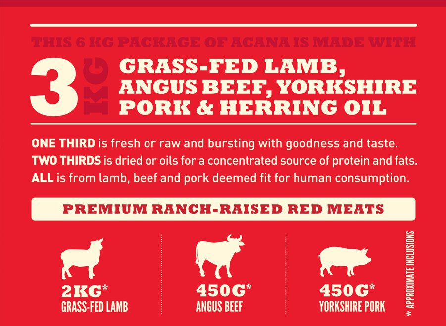 Acana Dog TF Classics Red. Etapa de la vida de la mascota: Adulto, Tamaño de raza: Medio (11 - 25kg), Sabor de la comida de la mascota: Ternera, Cordero, Cerdo, Peso: 11,4 kg, Sin cereales