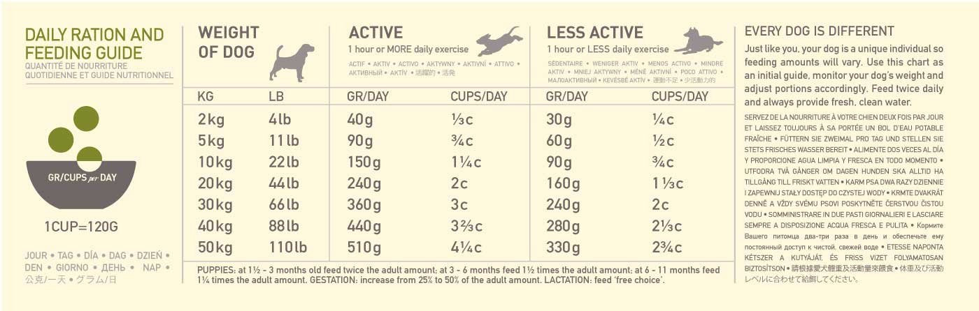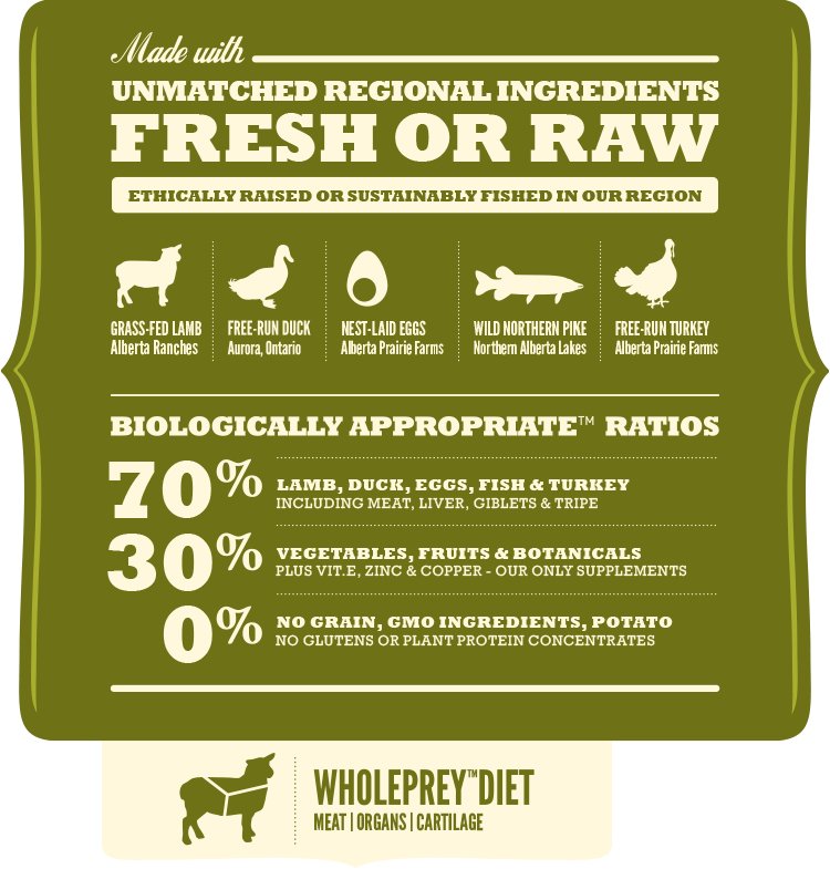 - Ingredientes: Rohes Lammfleisch (8%), frisches Entefleisch (8%), frische ganze Eier (8%), getrocknetes Lammfleisch (8%), getrockneter Hering (7%), getrocknetes Truthahnfleisch (7%), ganze grüne Erbsen, rote Linsen, Kichererbsen, frischer Nord-Hecht (4%), rohe Lammleber (4%), frische Enteninnereien (Leber, Herz, Nieren) (4%), frisches Truthahnfleisch (4%), Lammfett (4%), grüne Linsen, gesprenkelte Bohnen, ganze gelbe Erbsen, sonnengereiftes Alfalfa, Lachsöl (2%), Linsenfasern, getrockneter Lammknorpel (1%), roher Lammpansen (1%), brauner Seetang, frischer Kürbis, frischer Butternußkürbis, frische Pastinaken, frischer Gemüsekohl, frischer Spinat, frischer brauner Senf, frische Rübsamenblätter, frische Möhren, frische “Red Delicious”-Äpfel, frische “Bartlett”- Birnen, gefriergetrocknete Leber (von Huhn und Ente) (0,1%), frische Cranberries, frische Heidelbeeren, Chicoréewurzeln, Kurkuma, Mariendistel, große Klettenwurzeln, Lavendel, echte Eibischwurzeln, Hagebutten.