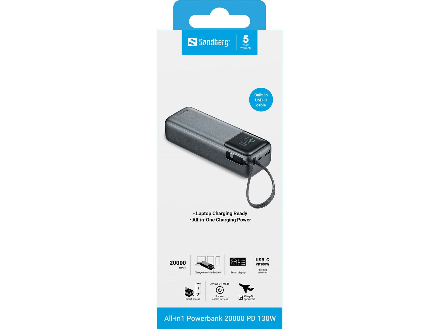 Sandberg All-in1 Powerbank 20000 PD 130W ofrece hasta un total de 130W a través de USB-C. El cable USB-C integrado lo hace fácil, y con puertos USB-C y USB-A, tienes máxima flexibilidad para cargar múltiples dispositivos. La elegante pantalla te muestra exactamente cuánta energía queda, así como el estado en tiempo real de entrada y salida. Todo en un tamaño apto para viajar con una capacidad de 20000 mAh, perfecto para llevar en un avión.