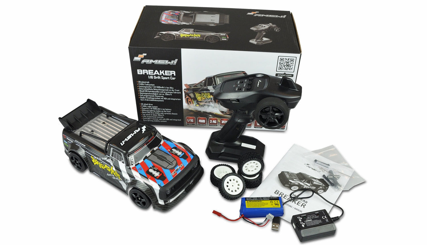 Amewi Breaker. Tipo de producto: Coche deportivo, Escala: 1:16, Tipo de motor: Motor eléctrico, Edad recomendada (mín.): 14 año(s). Tecnología de batería: Ión de litio, Capacidad de batería: 1200 mAh. Peso: 604 g