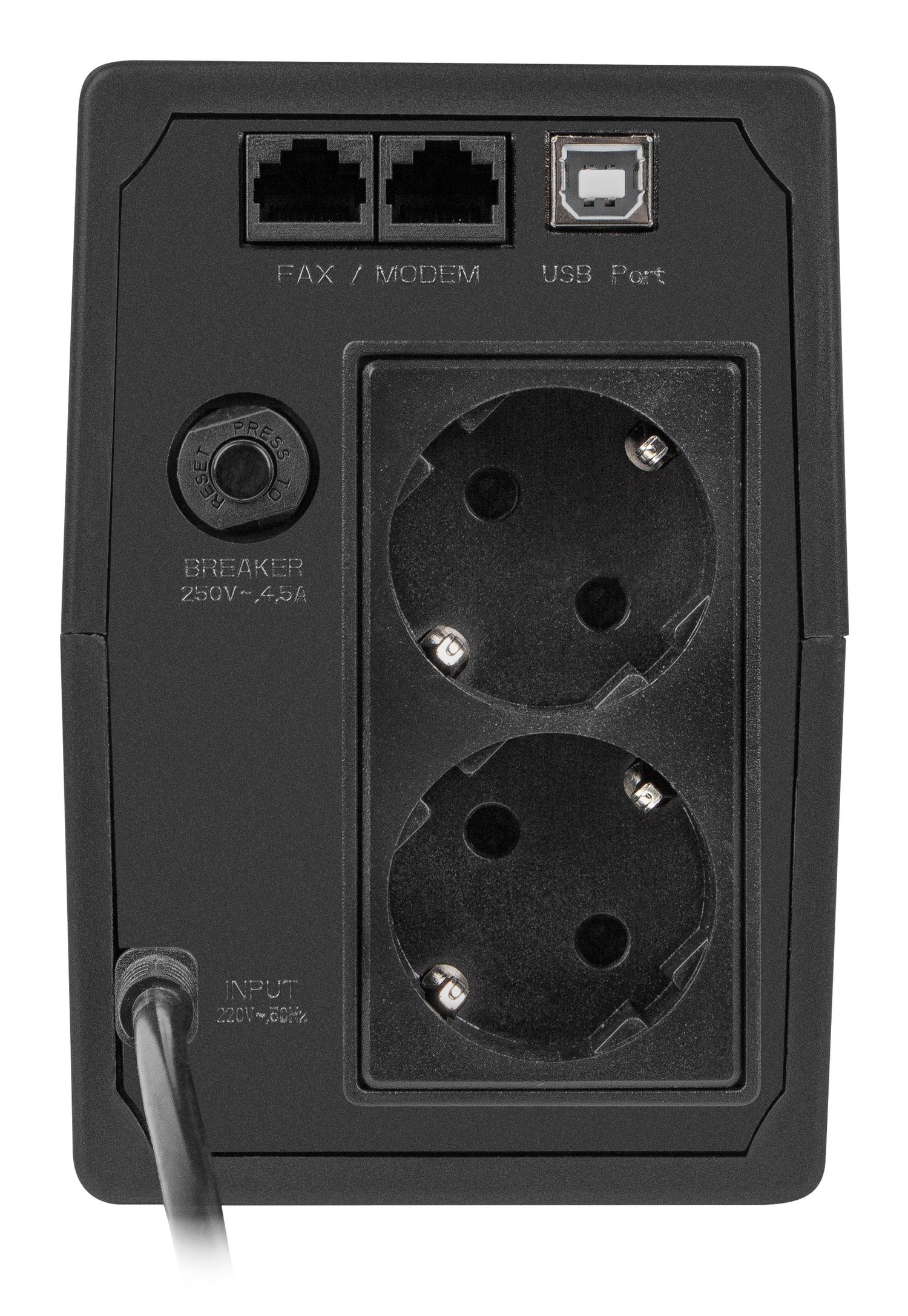 Armac H/850F/LED/V2. Topología UPS: Línea interactiva, Capacidad de potencia de salida (VA): 0,85 kVA, Potencia de salida: 480 W. Conector: Tipo F, Cantidad de salidas AC: 2 salidas AC, Tipo de puerto USB: Micro-USB B. Tecnología de batería: Plomo-ácido, Capacidad de la batería: 9 Ah, Voltaje de la pila: 12 V. Factor de forma: Escritorio, Color del producto: Negro, Código IP (International Protection): IP20. Ancho: 95 mm, Profundidad: 283 mm, Altura: 140 mm