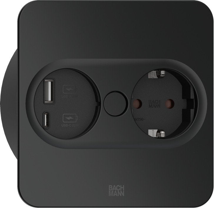 Bachmann 946.105. Tipo de enchufe: Type F + USB A + USB C, Tipo de instalación: Empotrado en escritorio, Grosor de mesa compatible (máx.): 4 cm. Color del producto: Acero inoxidable, Material de la carcasa: Metal, Plástico, Código IP (International Protection): IP20. Ancho: 115 mm, Profundidad: 115 mm, Altura: 42,5 mm. Número de productos incluidos: 1 pieza(s)