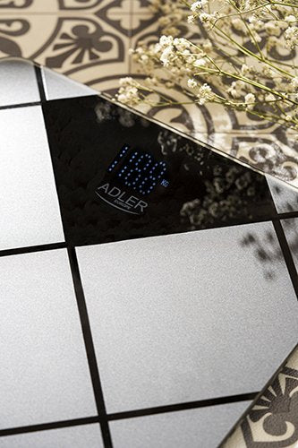 Adler AD 8169. Tipo: Báscula personal electrónica, Capacidad máxima de peso: 180 kg, Precisión: 100 g. Pantalla: LED, Tamaño de la pantalla (HxV): 30 x 30 mm. Alimentación: Batería, Tipo de batería: AAA, Voltaje de la pila: 1,5 V. Ancho: 300 mm, Profundidad: 300 mm, Altura: 21 mm. Cantidad por paquete: 1 pieza(s), Ancho del paquete: 324 mm, Profundidad del paquete: 313 mm