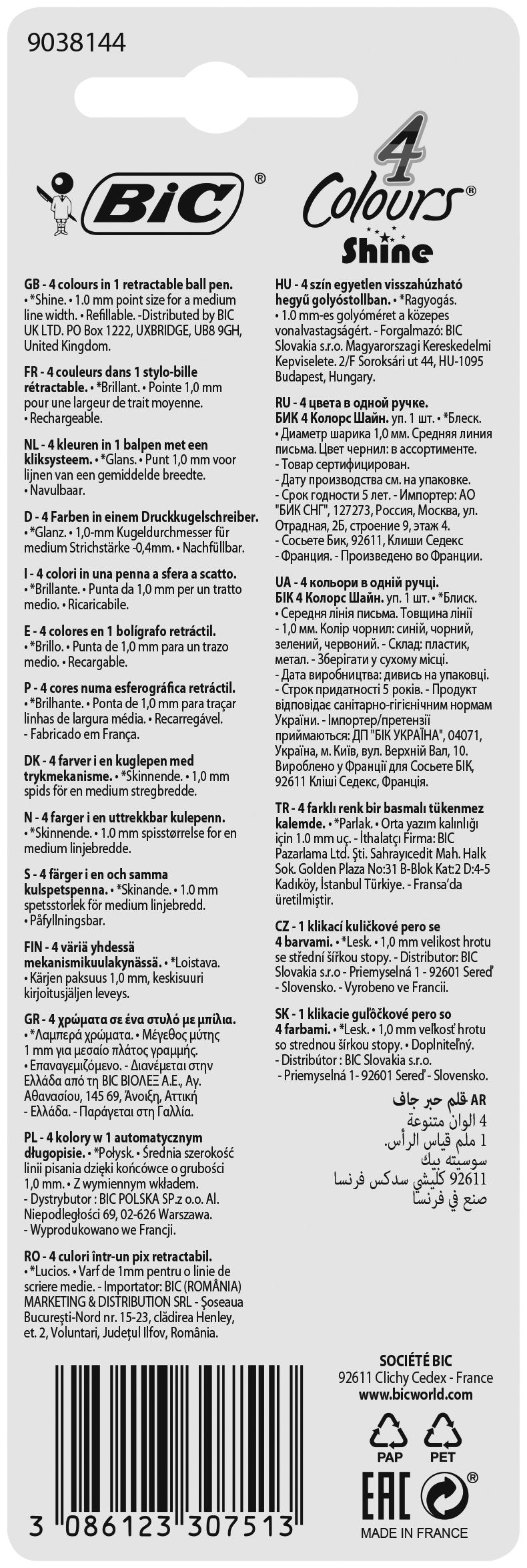 BIC Shine. Color del producto: Púrpura, Blanco, Colores de escritura: Negro, Azul, Verde, Rojo, Tipo: Bolígrafo multifunción. Cantidad por paquete: 1 pieza(s), Tipo de embalaje: Blister