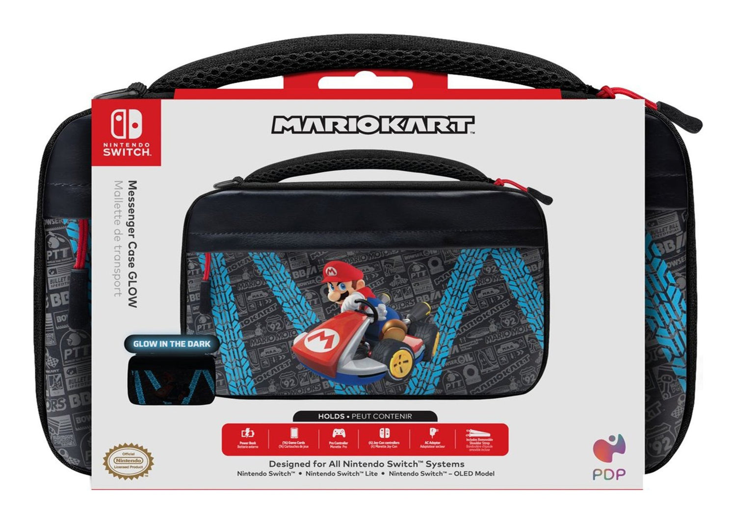 PDP Commuter: GLOW Mario Kart Drift, Funda protectora rígida, Nintendo, Negro, Azul, Gris, Nintendo Switch, Nintendo Switch Lite, Nintendo Switch OLED, Resistente al polvo, Resistente a rayones, Cremallera