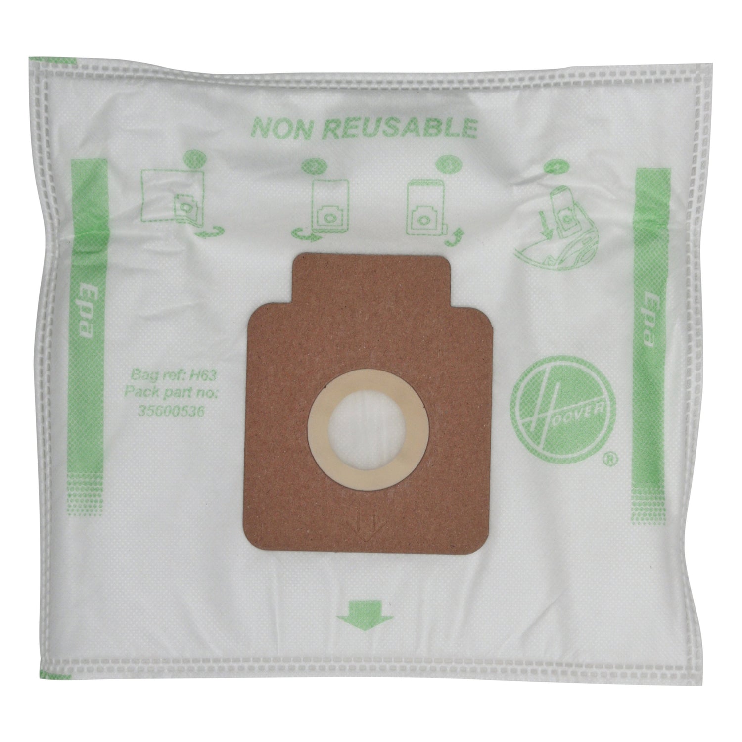 Hoover H63. Tipo de producto: Bolsa para el polvo, Adecuado para tipo aspirador: Aspiradora cilíndrica, Color del producto: Blanco. Cantidad por paquete: 4 pieza(s), Número de bolsas de polvo: 4 pieza(s)