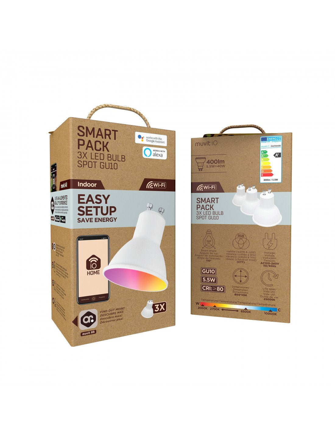 Pack de iluminación inteligente GU10 para toda la casa, controlable color, brillo y temperatura, a través de la app muvit IO Home.